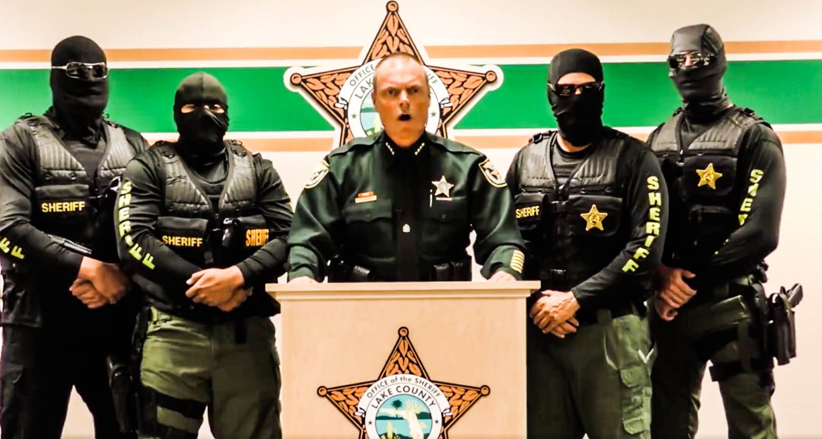In the video, Lake County Sheriff Peyton Grinnell stands at a podium while four officers stand behind him wearing masks and sunglasses. During the video, Grinnell sends out a warning to heroin dealers in Lake County, Florida that their crimes will no longer be tolerated.
