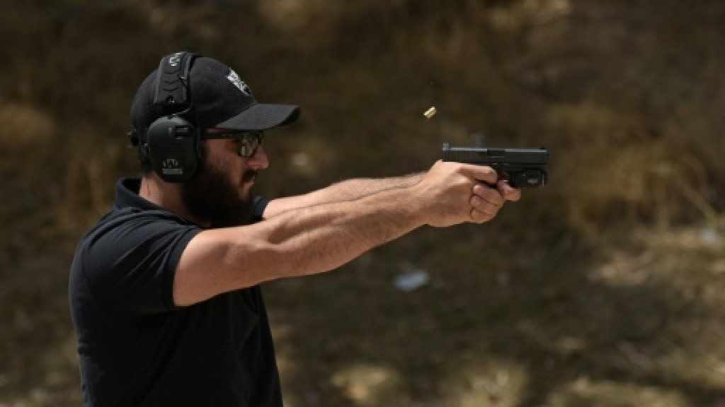 Rabbi Raziel Cohen, aka "Tactical Rabbi," shoots a Glock 9 mm pistol during a demonstration at the Angeles Shooting Ranges in Pacoima, California on May 20, 2019 AFP