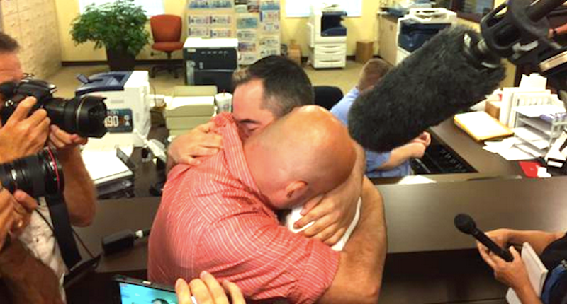 William Smith and James Yates hug after obtaining marriage license (Twitter)