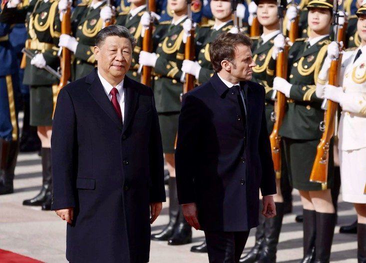In a Thursday morning meeting with Chinese Premier Li Qiang at the Great Hall of the People, Macron stressed the importance of dialogue between China and France "in these troubled times".