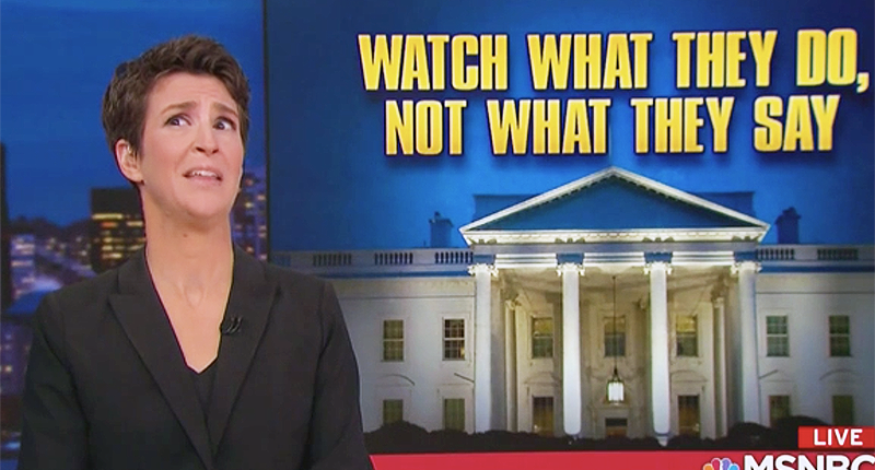 She noted that Politico had a headline about tuning out the White House, which can be a dangerous idea in a world where Trump is allowed to go unchecked. Instead, Maddow proposed, "watch what they do -- not what they say."