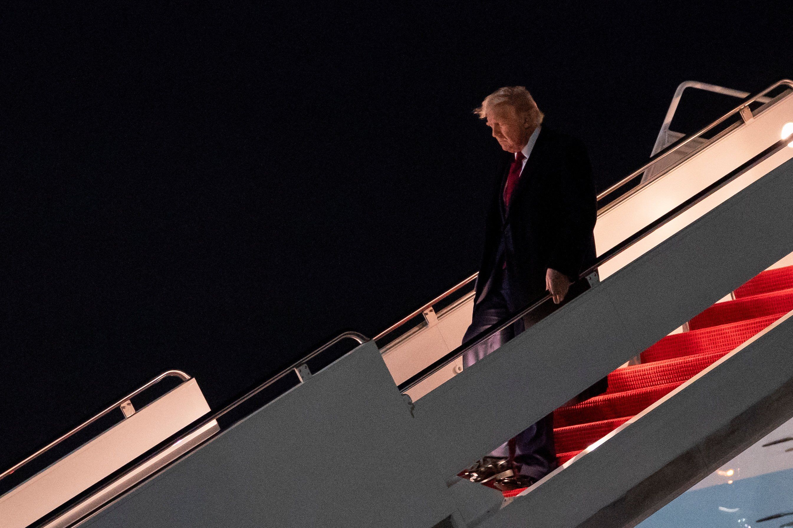 U.S. President Donald Trump exits Air Force One as he arrives at Joint Base Andrews in Maryland, U.S. April 13, 2025. REUTERS/Nathan Howard