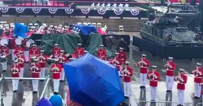 In a video posted to Twitter several hours before Donald Trump is scheduled to launch his "Salute to America" Fourth of July party, the Marine Corps band was compelled to perform in the pouring rain before a sparse crowd of early attendees and media awaiting the main event.