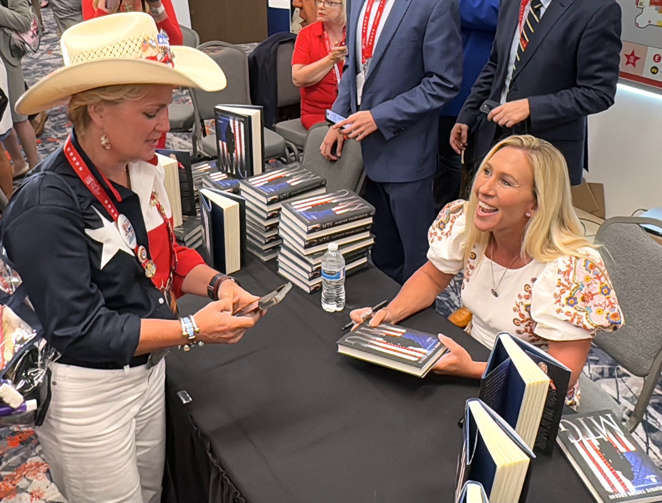 And while Republican attendees from across the United States can’t vote for the bombastic second-term congresswoman, they can donate to her and buy her book, which was on display Wednesday as more than 100 attendees lined up at her convention-endorsed book signing.