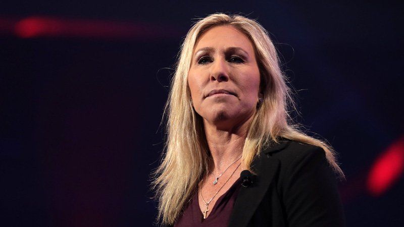 Congresswoman Marjorie Taylor Greene speaking with attendees at the 2021 AmericaFest. (Gage Skidmore/Flickr)