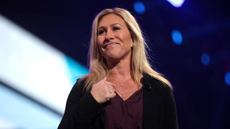 Congresswoman Marjorie Taylor Greene speaking with attendees at the 2021 AmericaFest. (Gage Skidmore/Flickr)