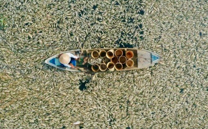 This a fisherman collects dead fish from a reservoir in southern Vietnam after a mass die-off in the midst of a heatwave (STR)