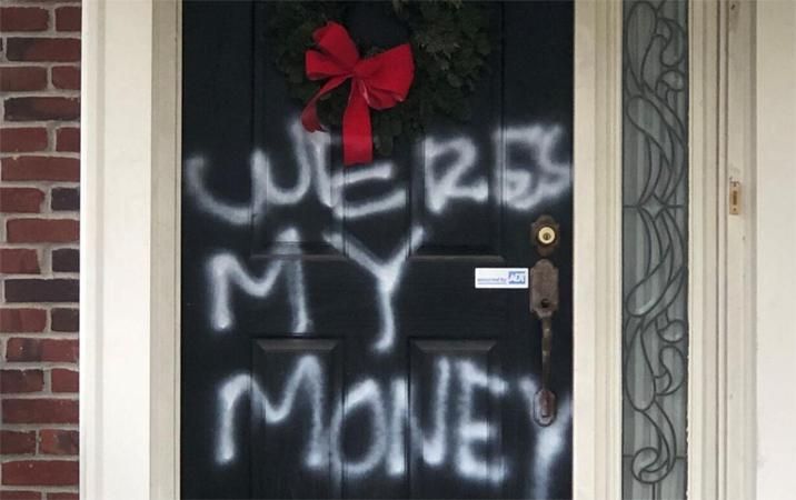 "As of Saturday morning, messages like 'where's my money' and other expletives were written with spray paint across the front door and bricks of the Kentucky Republican's Highlands residence," reported Ben Tobin.