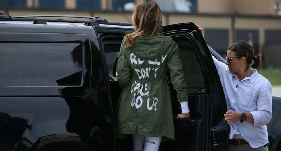 X user @Alf4Prez2020 replied with a photo of the first lady's notorious "I really don't care" green jacket that caused a media uproar in 2018 as speculation circulated she was taking a jab at her husband, former President Donald Trump.