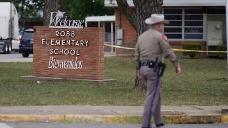 An officer walks outside of Robb Elementary School in Uvalde, Texas, May 24, 2022. (Allison Dinner/AFP)