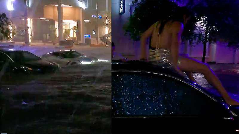 Another video shows a woman trying to get to a club, but her car was submerged. So, she climbed out of the sunroof clad in a short shiny, silver dress and slid down the windshield.