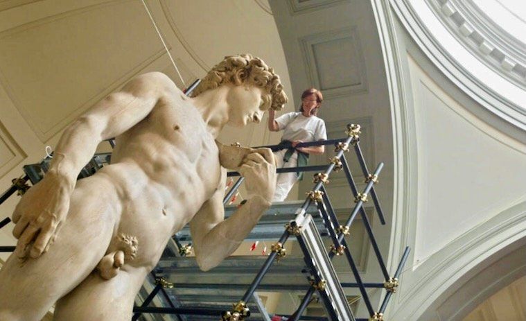 His personal restorer, Eleonora Pucci, climbs on a scaffolding for an up-close view -- part of a monitoring and cleaning ritual necessary for the preservation of the Renaissance icon visited by over two million visitors last year.