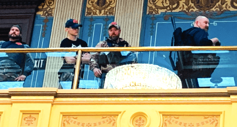 "Directly above me, men with rifles yelling at us," tweeted state Sen. Dayna Polehanki. "Some of my colleagues who own bullet proof vests are wearing them. I have never appreciated our Sergeants-at-Arms more than today. #mileg"