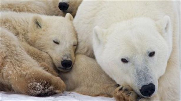 A mother Polar Bear sleeps on the frozen tundra with her cubs waiting for the Hudson Bay to freeze over on Nov. 13, 2007 outside Churchill, Mantioba, Canada (AFP)