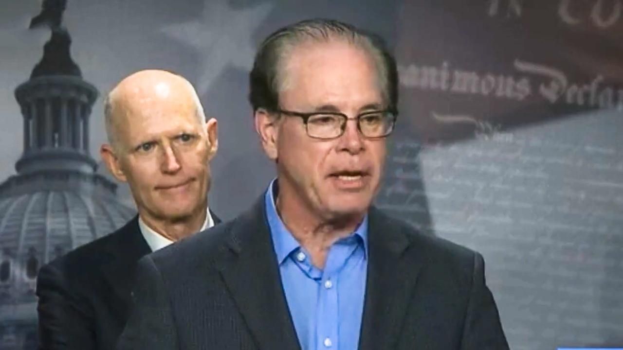 Sen. Mike Braun (R-IN) blasted former Republican senate candidate Herschel Walker as National Republican Senate Committee (NRSC) Chair Rick Scott scowled behind him.
