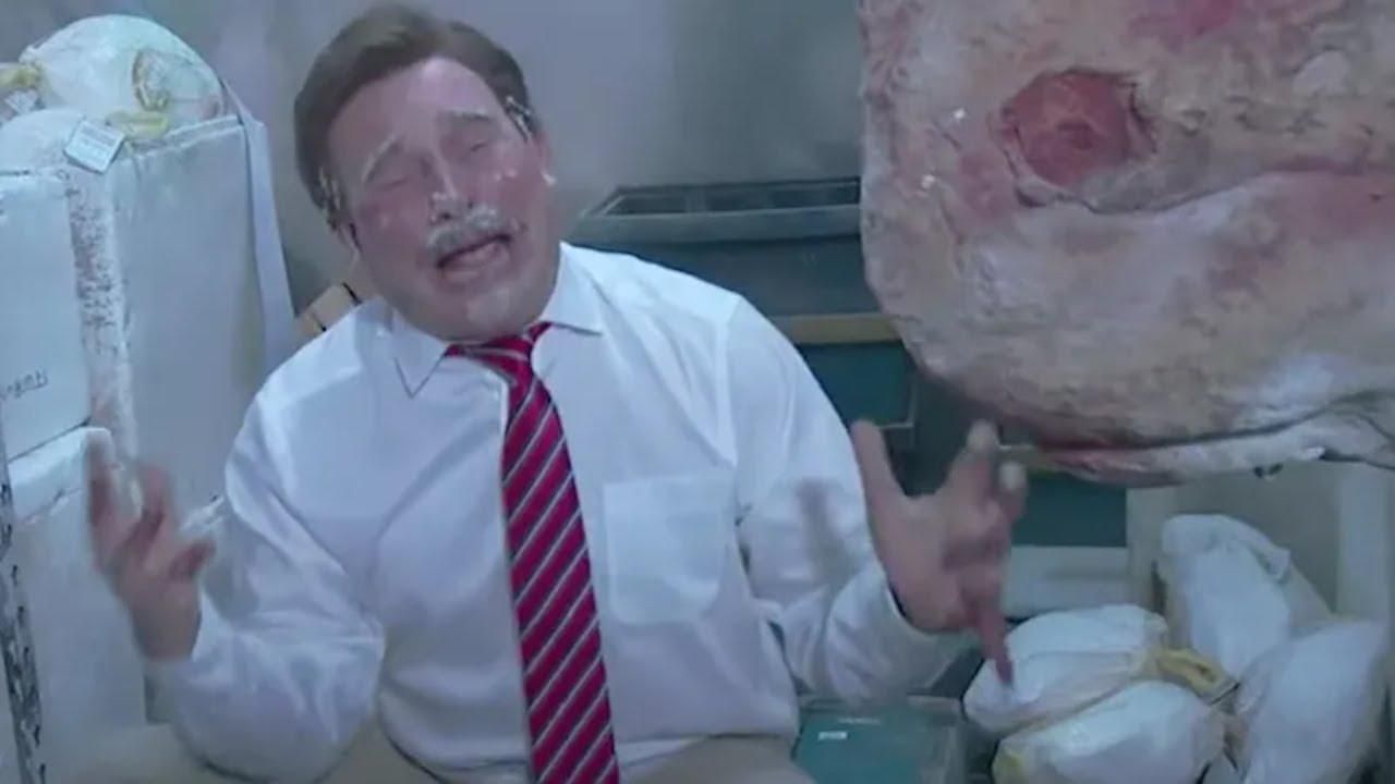 The fake Lindell explains that he's not cold because his mother gave birth to him "over an ice-fishing hole" in Minnesota, and that sub-zero temperatures are "nature's crack cocaine."