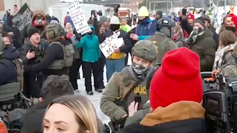 "So as you see this, they'veactually asked for the – oh, nowthey're pushing again," Young continued. "This isreally – oh, they're firing pepperballs. So as you see that smokecoming back our direction – I gotyou, Effie. I have my arm aroundour photographer here becausethis crowd is shifting on thisice. There's a lot of pushingand shoving, and people are veryangry. We have some peopleopening their jackets andsaying, 'Shoot me here, shoot mehere,' and that now they'repulling back. The man theyarrested in this direction overhere, falling back to the gatethat we talked about before.They have bear spray, as well, that they're using."