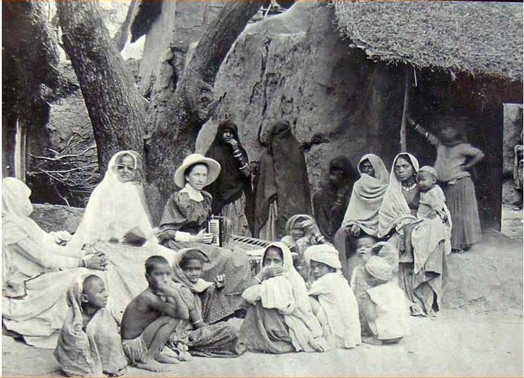 A missionary visits village women in the 1900s and is playing a small accordion.