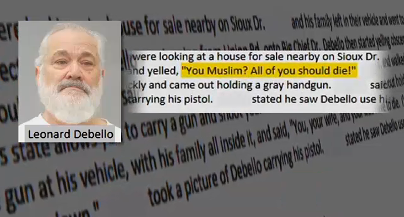 The father is from Jerusalem and his wife is from Iraq and their hope was to escape violence so that they could raise their four children in the safer city of St. Louis. They were looking at a home on the corner of Sioux Dr. and Big Chief Dr. but as they were leaving they encountered Debello. The family said he shouted, "You Muslim? You should die!" He allegedly continued roaring, "This state allows you to carry a gun and shoot you," walked inside and returned with a handgun. He then pointed the gun at the car with the children inside and yelled, "you, your wife and your kids have to die."