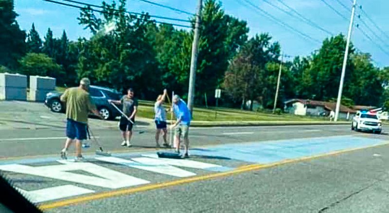 An image shared on social media shows four people who appear to be white painting over the words "Black Lives Matter" with what was called a "blue line."