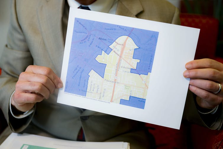 David Niven, a professor of political science at the University of Cincinnati holds a map demonstrating a gerrymandered Ohio district.