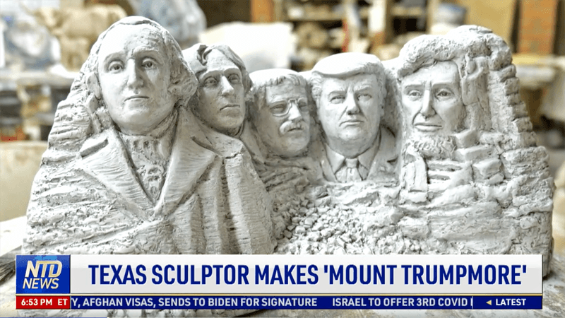 The "New Tang Dynasty" (NTD) evening news interviewed Trace Guthrie, a sculptor who sells $250 clay sculptures of Trump in between Theodore Roosevelt and Abraham Lincoln that he calls, "Mount Trumpmore."