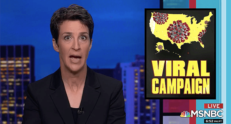 "Why quit while you're ahead?" asked Maddow. "Trump and company then decamped to South Dakota for a no-masks, no-social distancing event at Mount Rushmore. Before the first fireworks went off, we learned that Donald Trump Jr.'s girlfriend had also been diagnosed with the virus. The announcement came just hours after she had held an indoor unmasked fundraiser with South Dakota's Republican governor. South Dakota for that big event. So this is the national roadshow that the president is doing right now. There aren't any other big congregate events indoors for thousands of people of any kind anywhere in the country. It is just events for the president."