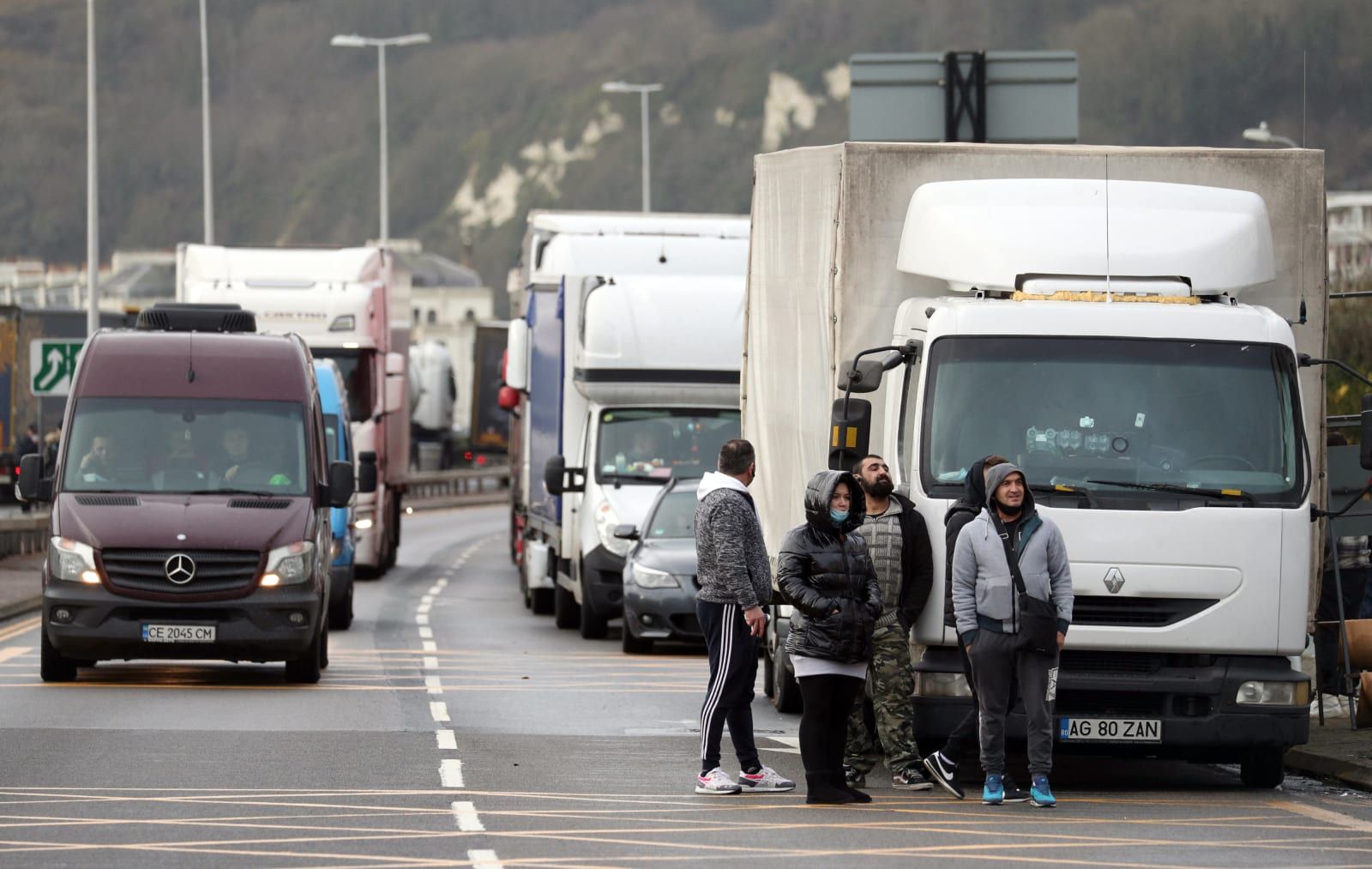 People stand next to vehicles parked up outside the entrance to the Port of Dover, Kent, England, on December 22, 2020, following the closing of French borders to arrivals from the United Kingdom. - Matthews Andrew/PA Photos/ABACA/TNS