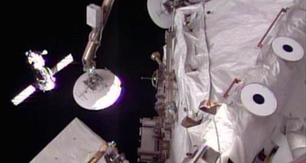 Still image from video shows the Soyuz TMA-12M spacecraft meters away from docking at the International Space Station on March 27, 2014 [AFP]