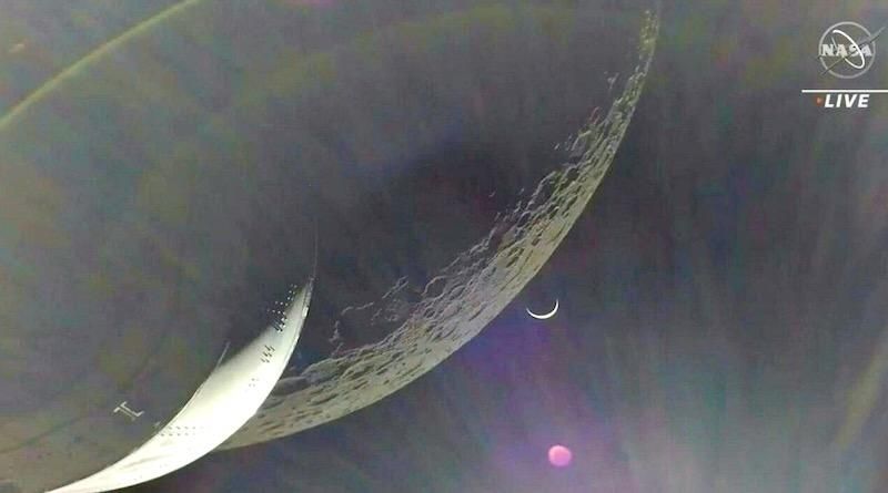 Earth is visible as a crescent in the minutes after Orion finished its engine burn around the Moon © Handout / NASA TV/AFP