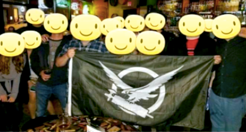 Bar patrons unwittingly pose for photo with American Vanguard flag (Twitter)