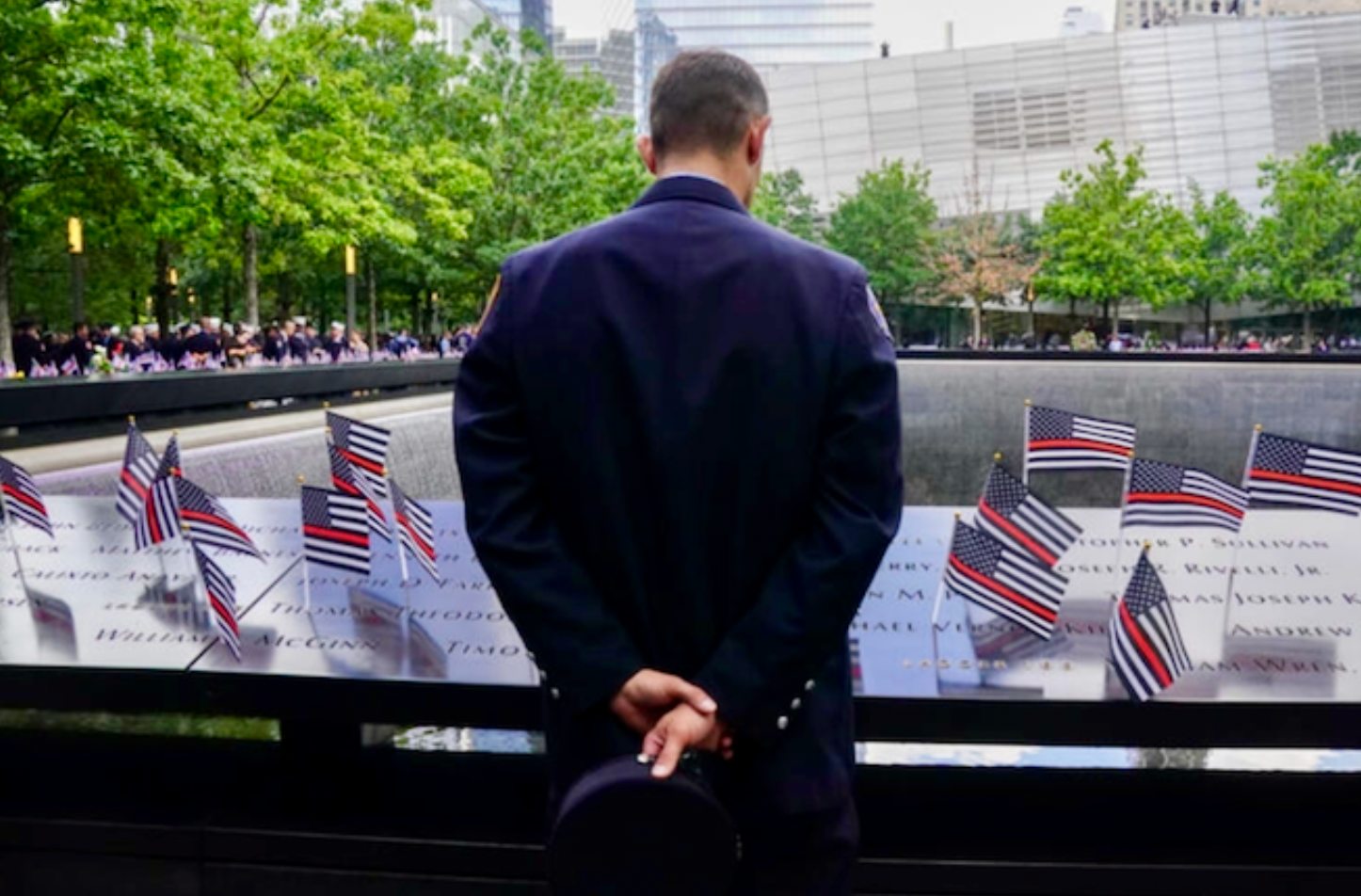 A New York firefighter looks at September 11 victims' names inscribed at the New York memorial on the 22nd anniversary of the 2001 Al-Qaeda terror attack © Bryan R. Smith / AFP