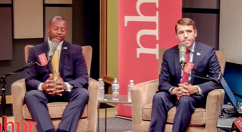 Eddie Edwards and Chris Pappas appear at New Hampshire debate (NHPR/screen grab)