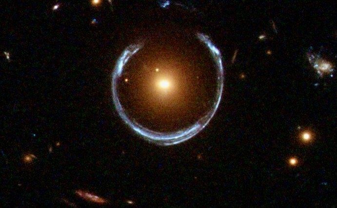 As a result, sometimes when we look at a distant galaxy we can see distorted images of other galaxies behind it. And if things line up perfectly, the light from the background galaxy will be smeared out into a circle around the closer galaxy.