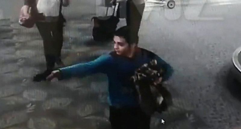 Without warning, he pulls out a 9mm semi-automatic handgun with his right hand and fires it repeatedly at targets off-screen. Travelers nearby can be seen reacting in horror and scrambling for cover as the shots ring out.