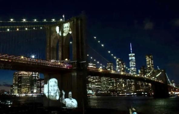 Black and white photos of Covid-19 victims are projected on to the Brooklyn Bridge as New York City marks more than 30,000 dead since the pandemic began