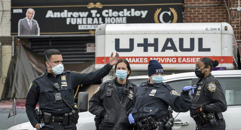 Police stand in front of a funeral home in Brooklyn on April 30, 2020 after dozens of bodies were found decomposing in trucks. AFP / Johannes EISELE.