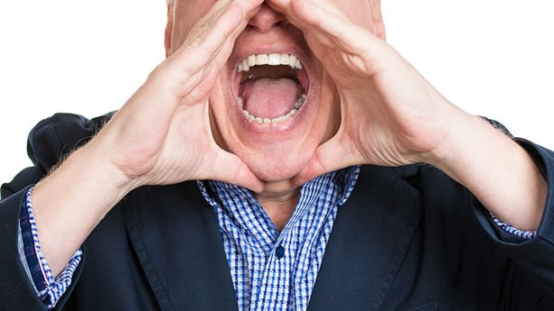["Closeup portrait, mad, upset, senior mature man, funny looking business man, hands to open mouth yelling, isolated white background" on Shutterstock]