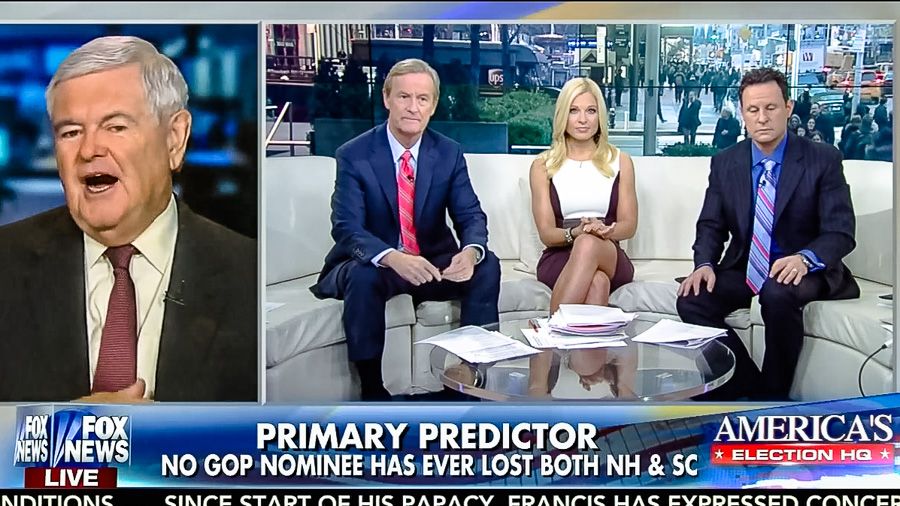 "That's because of you guys," Gingrich interrupted. "Donald Trump gets up in the morning, tweets to the entire planet at no cost, picks up the phone, calls you, has a great conversation for about eight minutes -- which would have cost him a ton in commercial money. And meanwhile, his opponents are all out there trying to raise the money to run an ad."