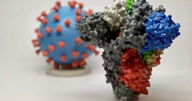 A 3D print of a spike protein of SARS-CoV-2 in front of a 3D print of a SARS-CoV-2 virus particle Handout National Institutes of Health/AFP/File