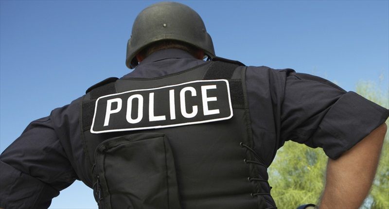 Rear view of policeman in uniform standing against car (Shutterstock)