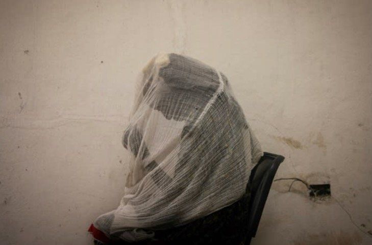 Rawa curls up on a chair, pulls her knees tight to her chest and hides her face with a large white veil as if to shield herself from the outside world.