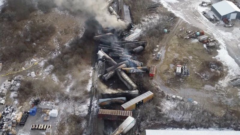 Aerial view of the train derailment wreckage in East Palestine. (Screenshot from NTSB B-roll recorded Feb. 5, 2023)