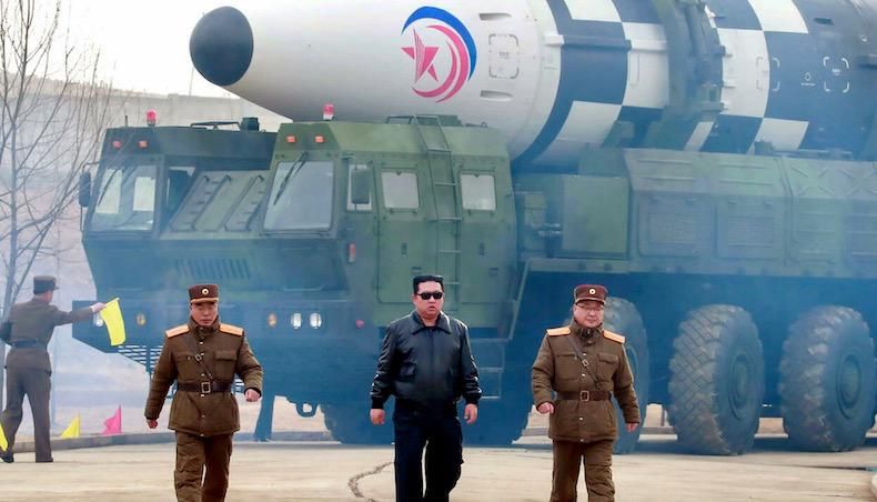Leader Kim Jong Un walks towards the camera, flanked by generals, as they prepare to fire the giant Hwasong-17 missile -- Pyongyang's first ICBM test since 2017.