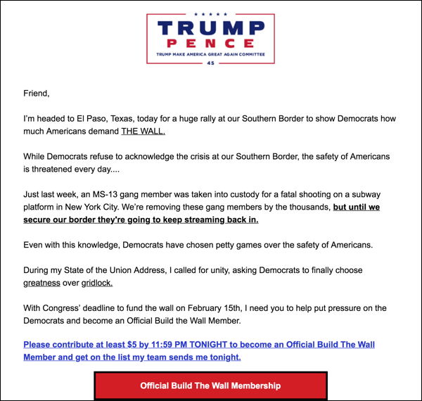 "Please contribute at least $5 by 11:59 PM TONIGHT to become an Official Build The Wall Member and get on the list my team sends me tonight."
