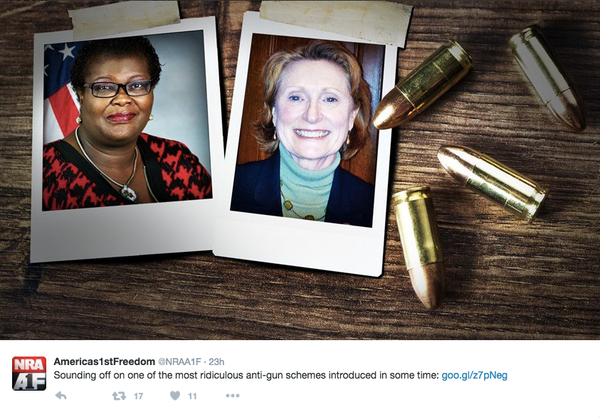 In response, the NRA publication "America’s 1st Freedom" tweeted an image Monday that showed photos of each lawmaker's face taped to a board, as if for target practice, and surrounded by several bullets, reported the New York Daily News.