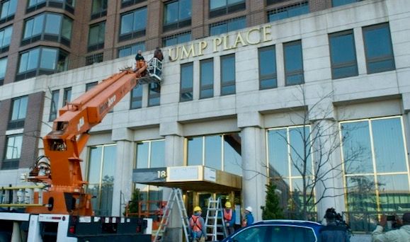 Workers remove Trump signage from 180 Riverside Boulevard on Manhattan's upper west side November 16, 2016 in New York