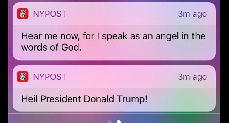 The tabloid newspaper did not provide details of the alerts from its app, but screen grabs posted online by Twitter users included an alert reading "Heil President Donald Trump!" among a series that ran on Saturday, which was April Fool's Day.