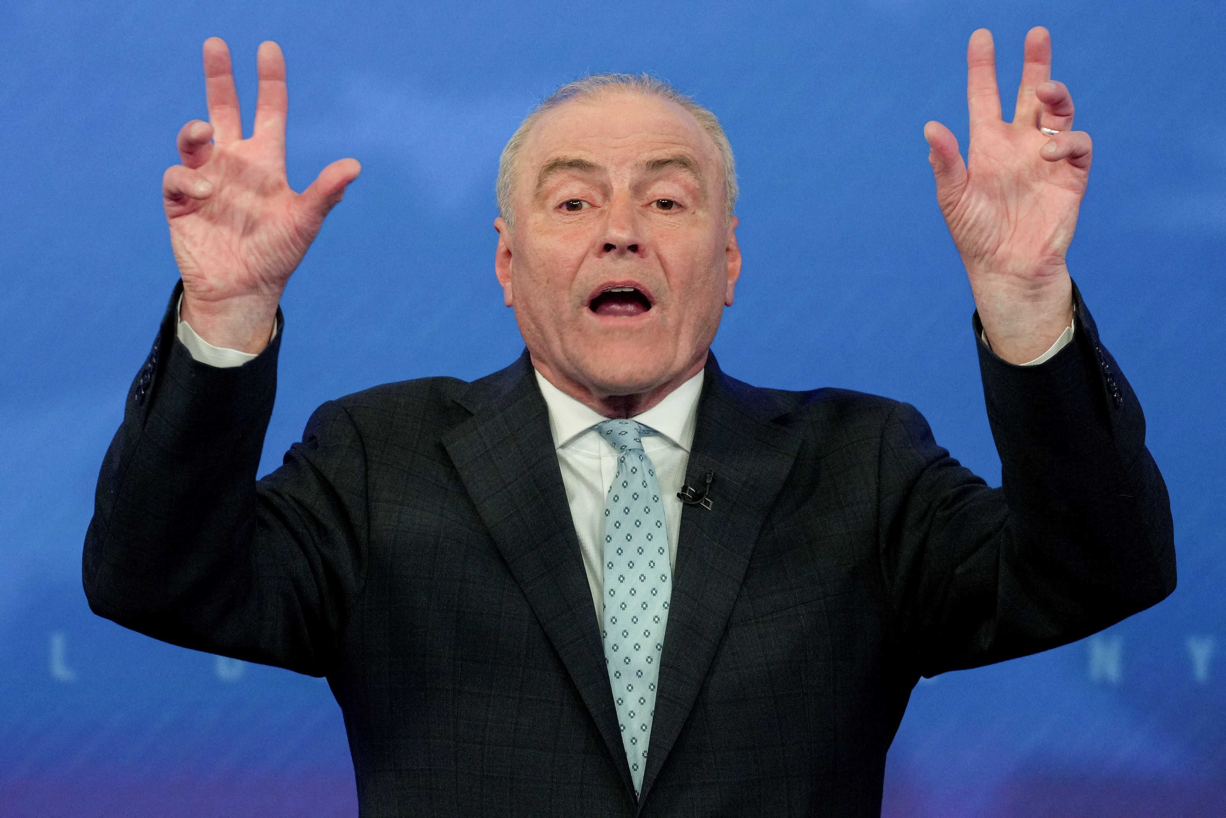Republican candidate Curtis Sliwa speaks during a mayoral debate, in New York, U.S., October 16, 2025. Angelina Katsanis/Pool via REUTERS