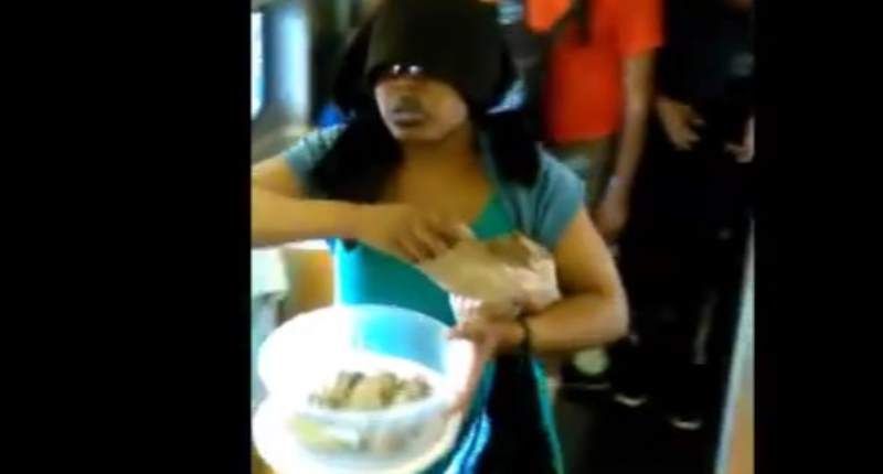 A woman identifying herself as Zaida Pugh poses as a homeless woman as part of a prank on a New York City subway train. (YouTube)